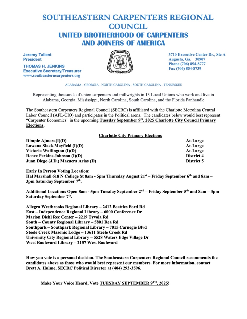 The Southeastern Carpenters Regional Council is affiliated with the Charlotte Metrolina Central Labor Council (AFL-CIO) and participates in the political arena. The candidates below would best represent “Carpenter Economics” in the upcoming September 9th, 2025, Charlotte City Council Primary Elections: