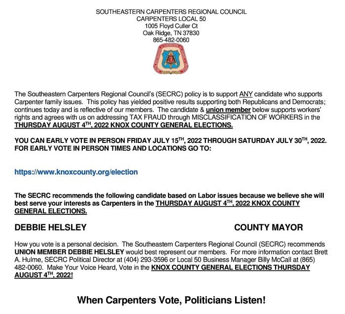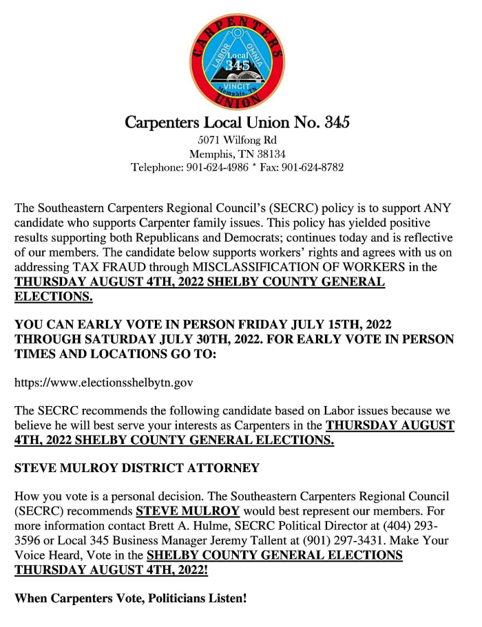 Members of Memphis Local 345 & Oak Ridge Local 50 are asked to review the list of candidates who are endorsed by the Southeastern Carpenters Regional Council for the upcoming general elections in Shelby (Local 345) and Knox (Local 50) counties on Thursday, August 4, 2022. These candidates - both Republican and Democrat - support workers' rights and agree with us on addressing tax fraud through the misclassification of workers.