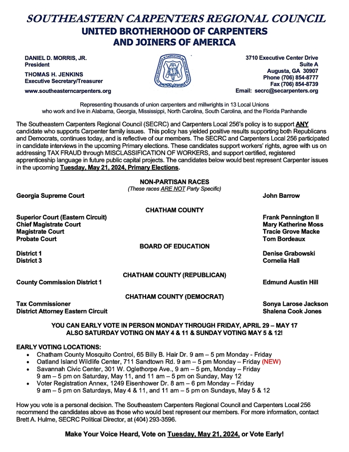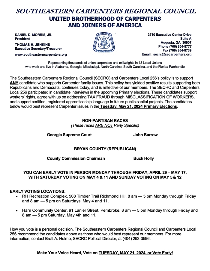 For the upcoming primary election in the jurisdiction of Local 256, the SECRC and Carpenters Local 256 participated in candidate interviews in the upcoming Primary elections. Here are the candidates that support workers’ rights, agree with us on addressing TAX FRAUD through MISCLASSIFICATION OF WORKERS, and support certified, registered apprenticeship language in future public capital projects. The candidates below would best represent Carpenter issues in the upcoming primary elections on Tuesday, May 21, 2024. Please see below for our endorsed candidates for Bryan and Chatham Counties:
